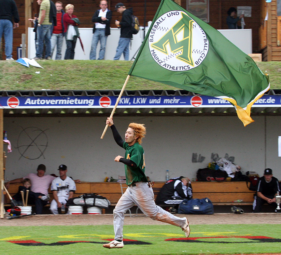 Denn Kipphan, für Manuel Möller „der beste First Baseman, den wir je hatten“, schnappt sich den Aufsetzer. Und in diesem Moment am 3. Oktober 2007, einem Mittwochnachmittag, kurz vor vier Uhr, sind die Mainz Athletics Deutscher Baseballmeister. Der Jubel der Spieler und der vielen mitgereisten Fans ist riesengroß.