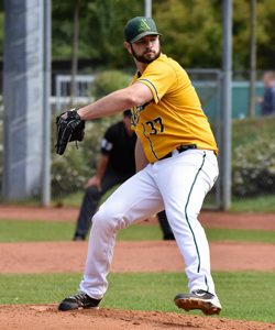 Auch Massingham ging jetzt vom Platz, Tim Stahlmann übernahm. „Am Samstag war ich ja noch auf den Platz gegangen und wusste: Heute kann für mich nichts schiefgehen. Die Offense muss halt zwei Punkte machen“, sagte der Reliever. „Am Sonntag wollte ich zu viel, war mental nicht so fokussiert.“ Ohne einen einzigen Hit und bei nur einem Aus kamen drei Regensburger auf Base – Stahlmann kam raus aus dem siebten Inning. Im achten aber waren wieder schnell alle Bases besetzt und diesmal ging’s nicht so gut aus, diesmal scorten zwei Mann zum 5:2. „Ich musste runterschalten“, erklärte Stahlmann. „Locker die Bälle reinwerfen – Batter machen ja auch Fehler. Das hat funktioniert.“